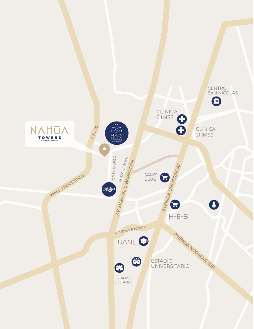 Nahua Towers se ubica en una de las zonas más consolidadas de la ciudad, a unos pasos de Plaza Fiesta Anáhuac. Su entorno ofrece comercios, restaurantes, escuelas, hospitales y servicios esenciales que facilitan la vida diaria.